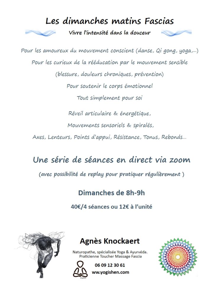 Les Dimanches matins Fascia, pour installer une pratique régulière. Mêler le confort de chez soi et la rencontre du groupe pour vivre ensemble un réveil à la fois articulaire et énergétique, explorer les mouvements Fascias sous toutes leurs formes : Axes, Lenteur, Points d’appui, Tonus, Rebonds, Résistance, Spirales…