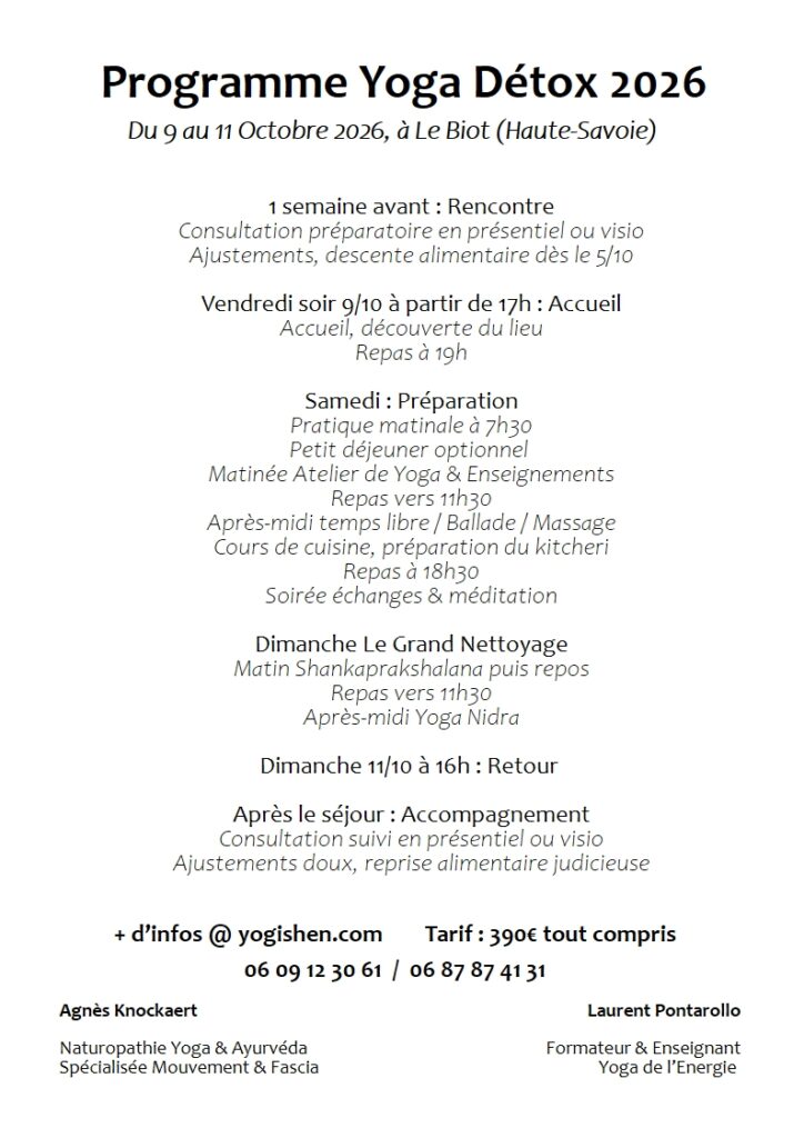 Le protocole se prépare quelques jours avant en commençant par un réglage alimentaire qui limite les excitants, produits carnés et laitiers, pour alléger le processus digestif et commencer déjà à alléger l’organisme. Le week end sera apprécié par son rythme doux, des ateliers de yoga, temps de repos et ballade. Nous mangerons du Kitcheri, le plat complet typique des cures ayurvédiques, savoureux, nourrissants, spécialement préparés selon la saison. Une fois le Grand Nettoyage effectué, le corps en profite pour se régénérer, il faut rester bienveillant en continuant à se reposer, et reprendre un quotidien plus épuré que d’habitude.