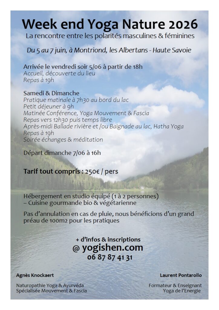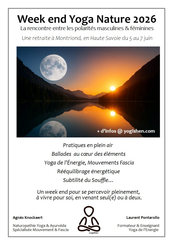 Le week end Yoga Nature aura lieu à Montriond, aux Albertans du 5 au 7 juin 2026. Cette année nous explorerons « La rencontre entre les polarités masculines et féminines ».